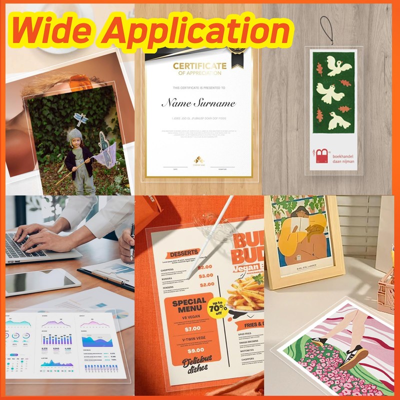 • WIDE APPLICATION:It is perfect for protecting your photos, certificates, cards, recipes, stickers, stencils,planner decorations, to-do lists, recipe cards, and schedulers,collected news and magazine ,and more because our self-adhesive laminated paper is waterproof, transparent, sticky, and wipeable. In addition, you can also be creative and use it to make handicrafts such as dried flowers and specimens or paste the clear laminating sheets in the kitchen, window, and other places that are not easy to clean. Don't limit your imagination, and just create.