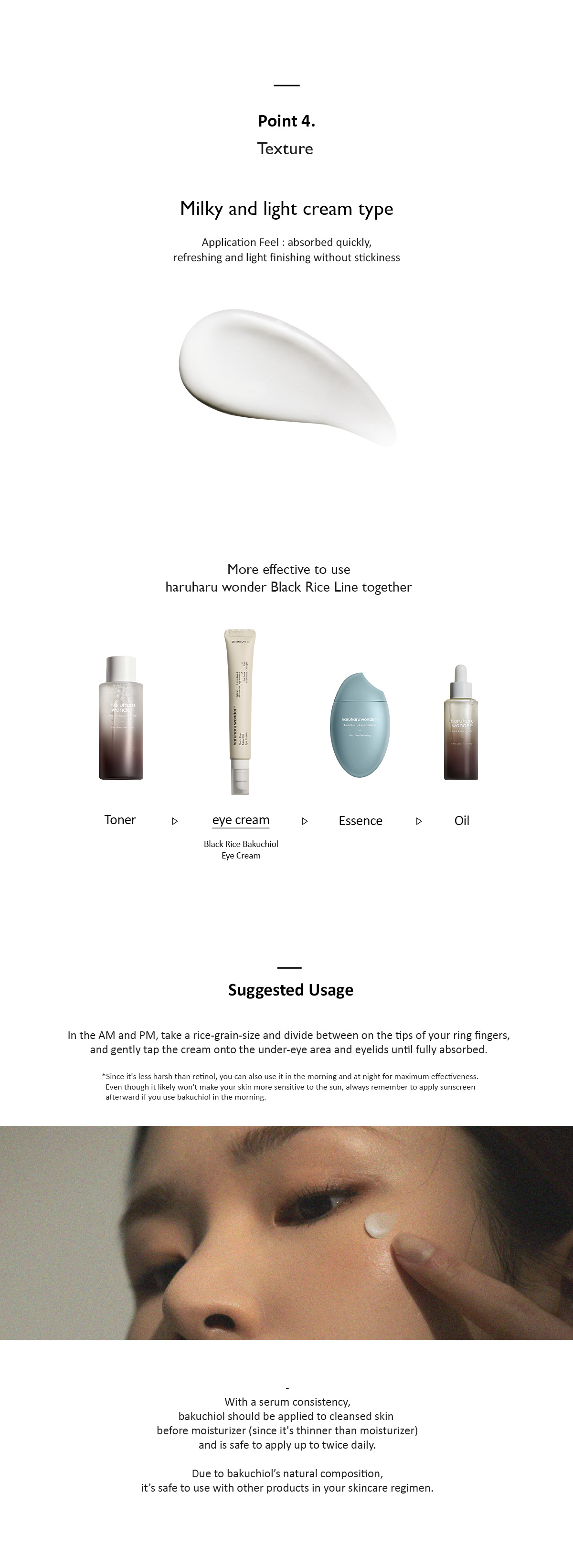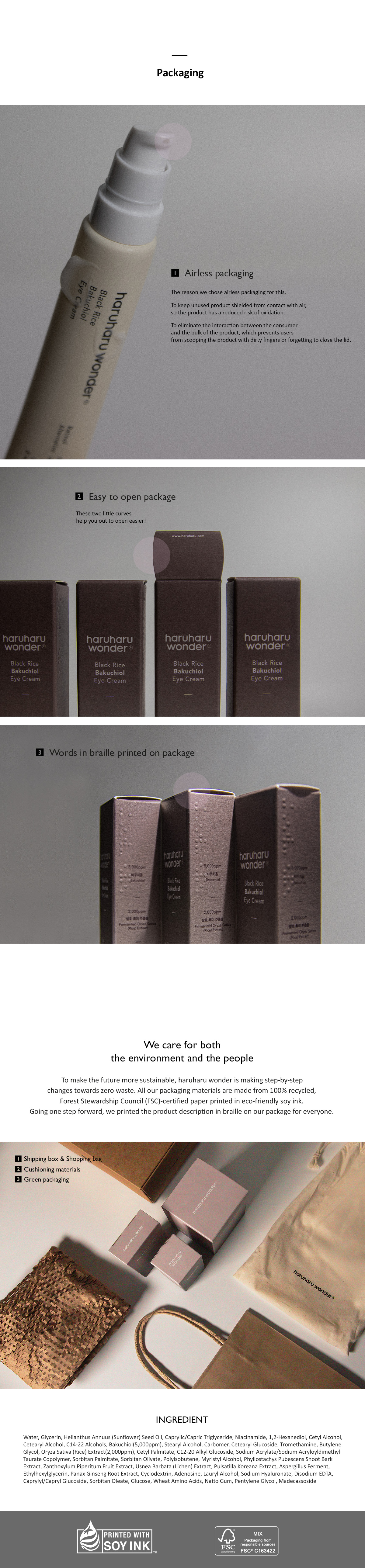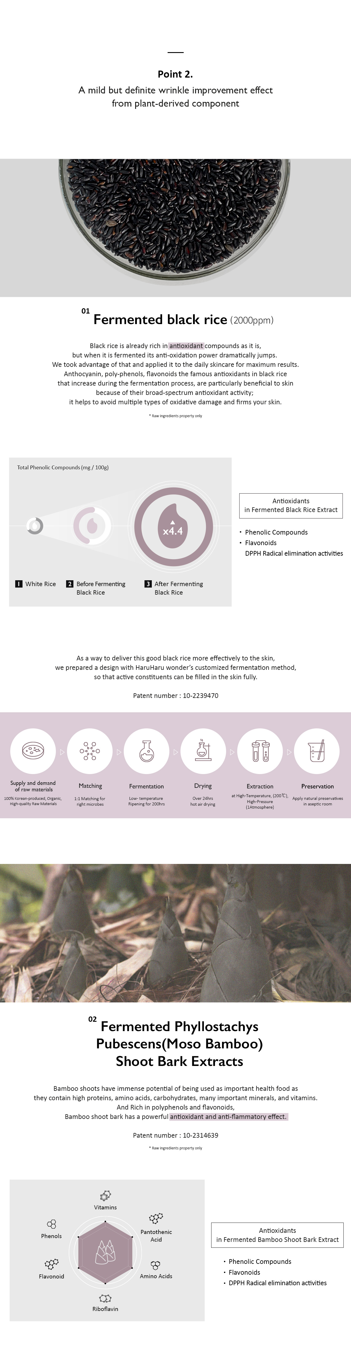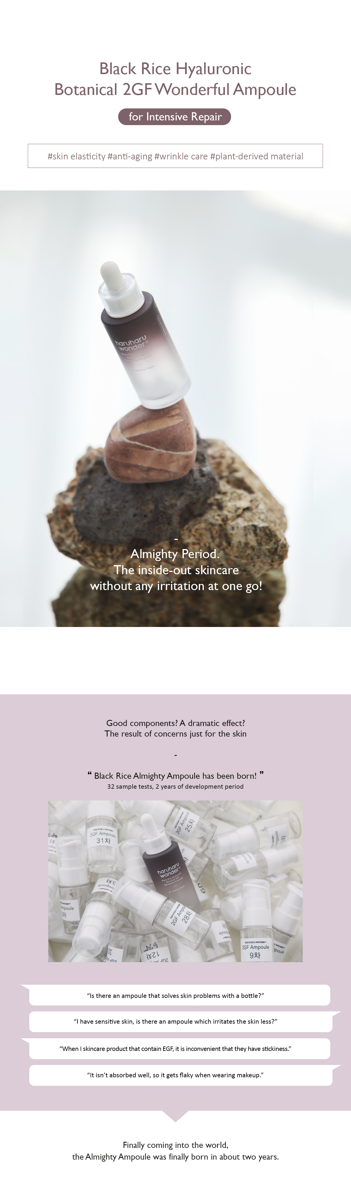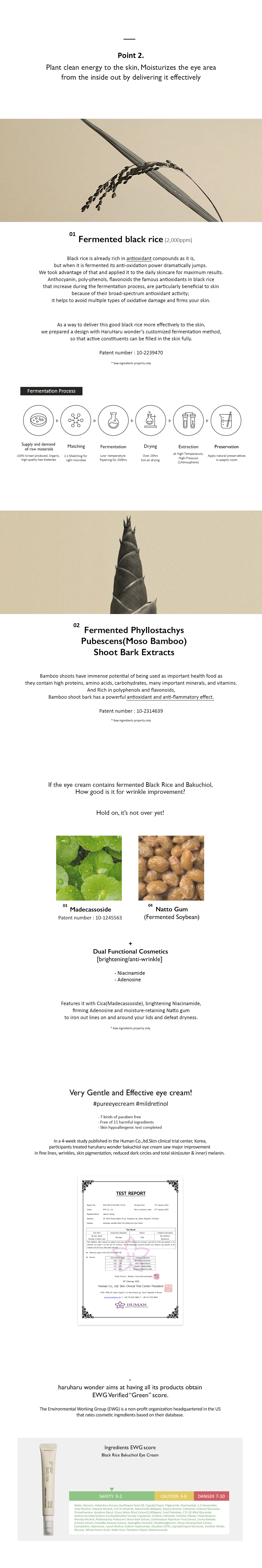 • Ingredients: Haruharu wonder Black Rice Botanical 2GF Wonderful Ampoule 30mL Ingredients: Water, Pentylene Glycol, Propanediol, Glycerin, Oryza Sativa (Rice) Extract (10,000ppm), Butylene Glycol, Ammonium Acryloyldimethyltaurate/VP Copolymer, 1,2-Hexanediol, Zanthoxylum Piperitum Fruit Extract, Pulsatilla Koreana Extract, Usnea Barbata (Lichen) Extract, Aspergillus Ferment, Panax Ginseng Root Extract, Cyclodextrin, Phyllostachys Pubescens Shoot Bark Extract, Sodium Hyaluronate (600ppm), Xanthan Gum, Dipotassium Glycyrrhizate, Adenosine, Disodium EDTA, Chlorella Vulgaris Extract, Madecassoside, Vincetoxicum Atratum Extract, Rice sh-Oligopeptide-1 (10ppm, 25%), Rice sh-Polypeptide-1 (10ppm, 5%), Mannitol, Sodium Chloride, Disodium Phosphate, Sodium Phosphate, Potassium Chloride, Potassium Phosphate Haruharu wonder Black Rice Hyaluronic Toner Unscented 30mL Ingredients: Water, Betaine, Glycerin, Propanediol, Scutellaria Baicalensis Root Extract, Oryza Sativa (Rice) Extract (2,000ppm), Phyllostachys Pubescens Shoot Bark Extract (2,000ppm), Xanthan Gum, Cellulose Gum, 1,2-Hexanediol, Butylene Glycol, Pulsatilla Koreana Extract, Zanthoxylum Piperitum Fruit Extract, Usnea Barbata (Lichen) Extract, Aspergillus Ferment, Sodium Gluconate, Hyaluronic Acid (600ppm), Beta-Glucan, Tamarindus Indica Seed Gum, Panax Ginseng Root Extract, Glucose, Cyclodextrin Haruharu wonder Black Rice Bakuchiol Eye Ceam 20mL Ingredients: Water, Glycerin, Helianthus Annuus (Sunflower) Seed Oil, Caprylic/Capric Triglyceride, Niacinamide, 1,2-Hexanediol, Cetyl Alcohol, Cetearyl Alcohol, C14-22 Alcohols, Bakuchiol (5,000ppm), Stearyl Alcohol, Carbomer, Cetearyl Glucoside, Tromethamine, Butylene Glycol, Oryza Sativa (Rice) Extract (2,000ppm), Cetyl Palmitate, C12-20 Alkyl Glucoside, Sodium Acrylate/Sodium Acryloyldimethyl Taurate Copolymer, Sorbitan Palmitate, Sorbitan Olivate, Polyisobutene, Myristyl Alcohol, Phyllostachys Pubescens Shoot Bark Extract, Zanthoxylum Piperitum Fruit Extract, Usnea Barbata (Lichen) Extract, Pulsatilla Koreana Extract, Aspergillus Ferment, Ethylhexylglycerin, Panax Ginseng Root Extract, Cyclodextrin, Adenosine, Lauryl Alcohol, Sodium Hyaluronate, Disodium EDTA, Caprylyl/Capryl Glucoside, Sorbitan Oleate, Glucose, Wheat Amino Acids, Natto Gum, Pentylene Glycol, Madecassoside