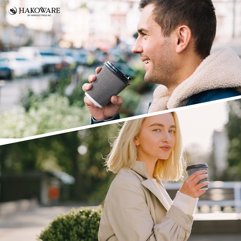 Harvest Pack GOURMET SHOWCASE [150 SET 8 oz Disposable Coffee Cups, Insulated Ripple Double-Walled Paper Cup with Lid, Black and White Geometric, Tea Hot Chocolate Drinks To go