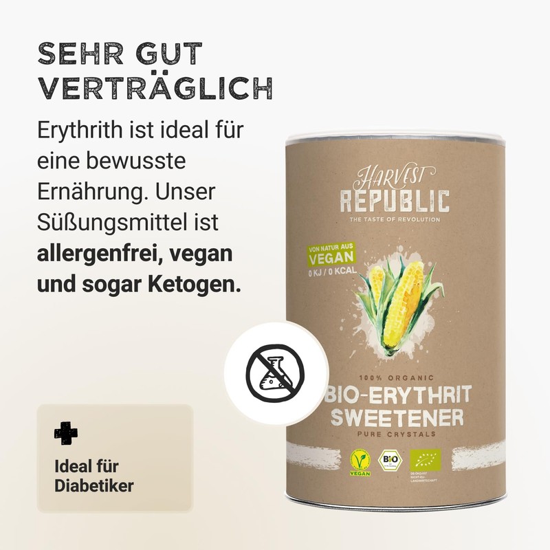 - Natural substitute: our organic erythritol is a natural sugar substitute for conventional sugar. Made from plant-based organic raw materials, the sweetener is allergen-free, vegan and even ketogenic.