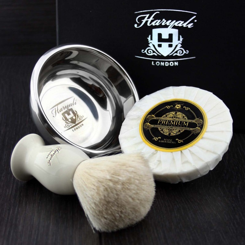 Haryali London 4 Piece Men's Shaving Set with 3 Razor Blades and White Badger Hair, Shaving Brush, Soap and Bowl, Perfect Set for Men
