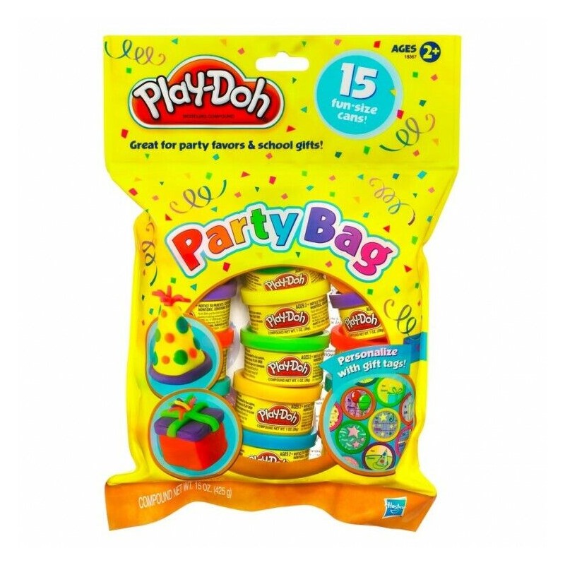 Share the fun and share the creativity with this Party Bag full of 15 cans of PLAY-DOH modeling compound. Featuring gift tags on the top of each one, these brightly colored cans are perfect for passing out to your friends at your next party. You can each mold cool things on your own or combine to create one giant, amazing creation! Moms are sure to love these, too, and grab one on-the-go to keep imaginative kids entertained anywhere.Bag contains 15 one-ounce cans of PLAY-DOH brand modeling compound.Ages 2 and up.