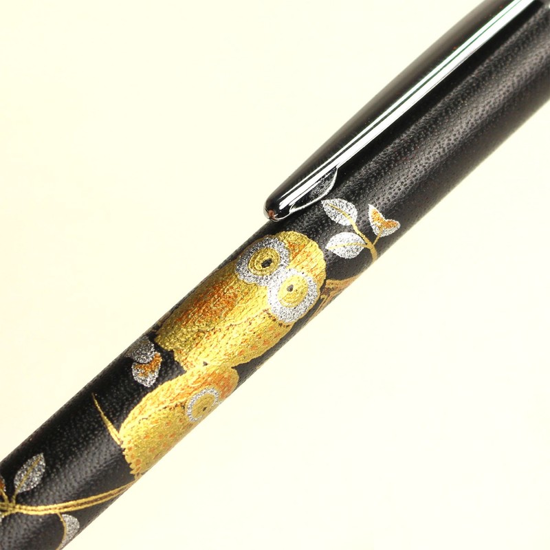 Hashimoto Lacquerware Ballpoint Pen, Genuine Leather, Honjin Makie, Black Leather, Owl, Paulownia Box Included