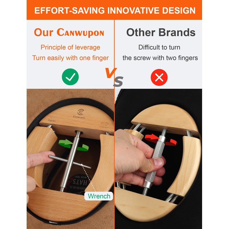 - Unique Labor-Saving Design: Unlike traditional hat stretcher, Canwupon's hats stretchers adopts an innovative heavy-duty cross-shaped wrench unique design, allowing you to easily rotate the stainless steel rod in the center with just one finger, allowing you to easily expand the size of the hat without any tool . Enjoy an unprecedented convenient experience.