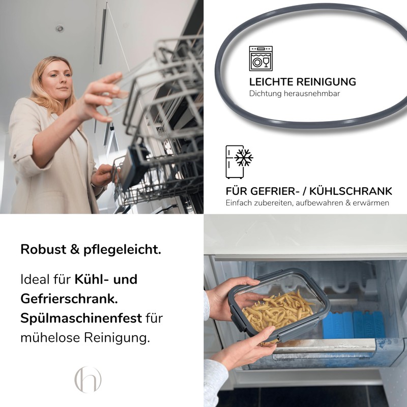 • Full view: we deliberately rely on a glass lid (tempered 2 mm glass in plastic frame with additional silicone seal) - so we allow you to quickly and easily view the contents without having to open the lid when it comes to storing the fridge/freezer. This revolutionises the classic food storage containers made of plastic. So the storage containers are ideal for sausage storage fridge.
