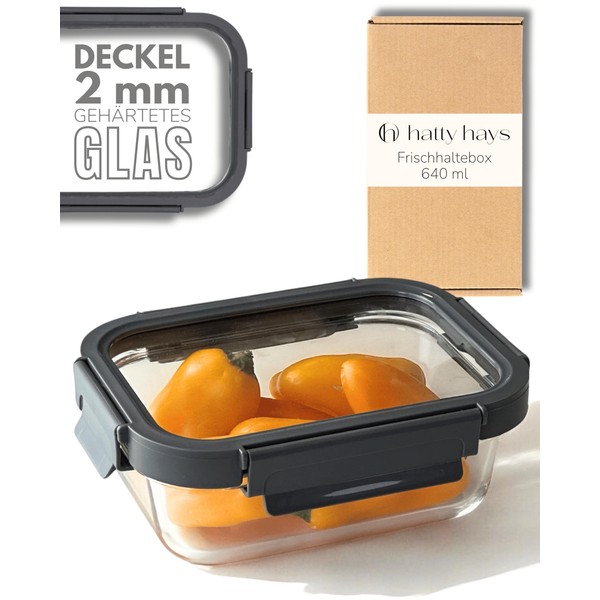 HATTY HAYS Airtight Food Storage Containers with Lid, 640 ml, Glass Container with Glass Lid and Plastic Frame, Meal Prep Boxes Ideal as Cold Cuts Boxes for Fridge or Casserole Dish with Lid