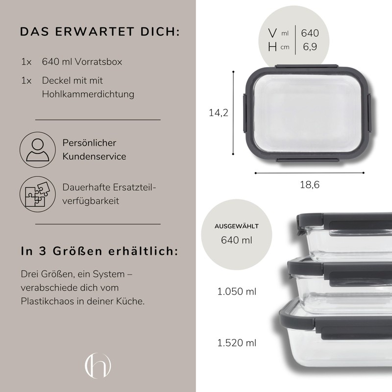 • Perfect sizes for any occasion – flexibility for every day: storage jars with lids airtight in 640 ml adapts to your everyday life. Ideal for small snacks or larger meals - organise your supplies efficiently and keep everything fresh and delicious in your food container. Whether as cold food boxes for fridge glass or cheese box fridge.