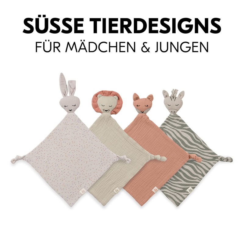• Neutral designs for boys and girls: the cuddly blanket baby is available in various colours and animal designs such as zebra, rabbit, lion and fox
