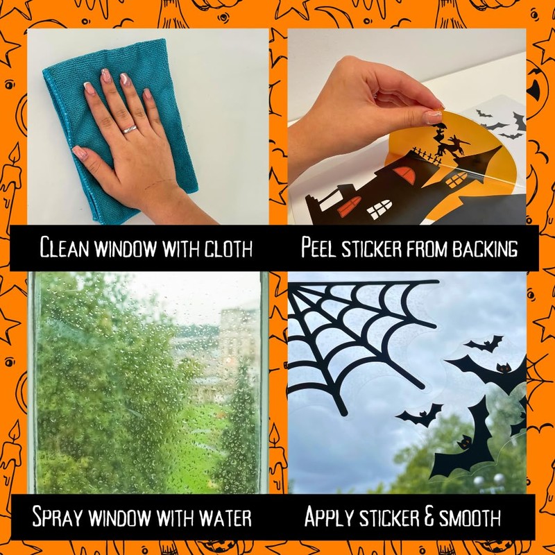- 🕷 Our Top Tips - First clean the window you will be using, peel the stickers, stick and you are done! We recommend spraying water onto the smooth surface first, and then slide the decal into place, taking your time to push out all the air bubbles.
