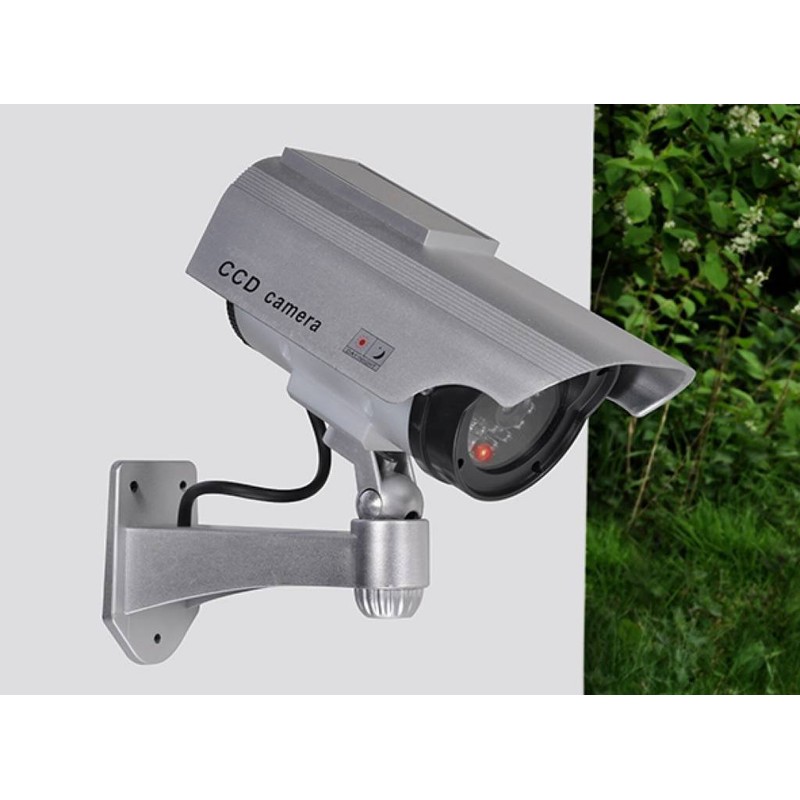 With wall mount and cable connection dummy with 1 red flashing LED and sun visor to cover the wrong lens