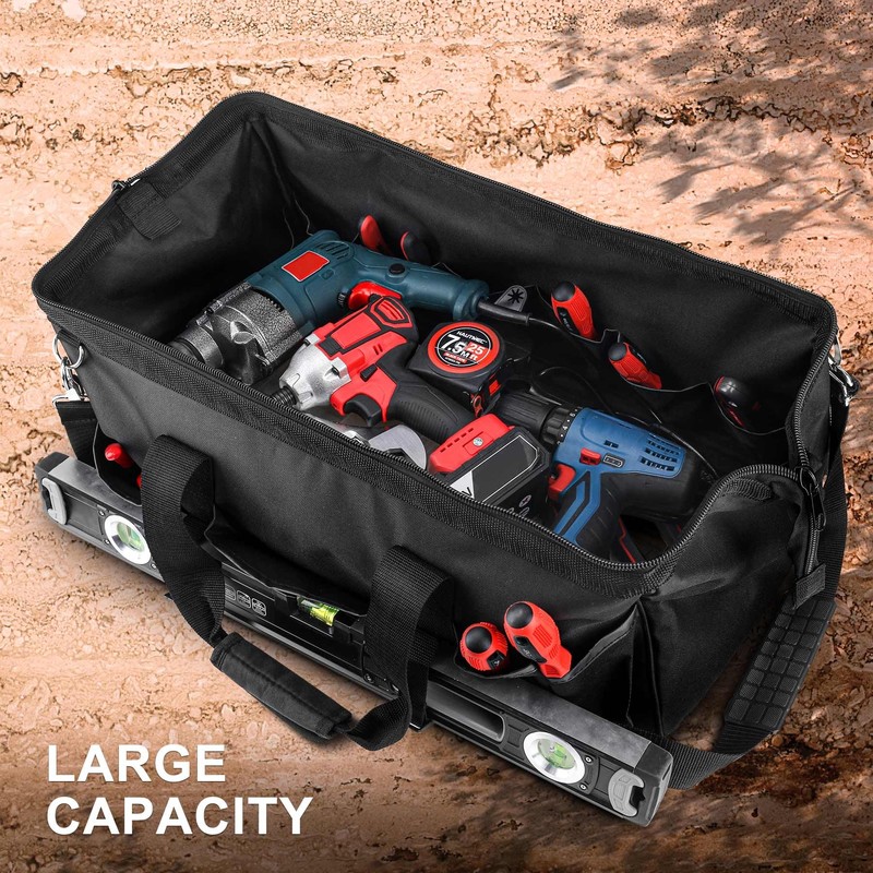 • This large tool tote bag has 7 external pockets, 15 internal pockets,and large interior to carry power tools, circular saw, hard hat, etc.