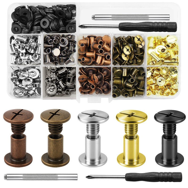 - 160 sets of Chicago screws: the set contains a total of 160 sets of M5.8 mm Chicago screws, available in 5 colours silver/gold/bronze/black/red copper, 160 pieces nylon washers, a screwdriver and a punching press.