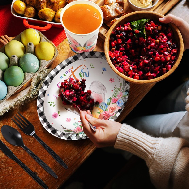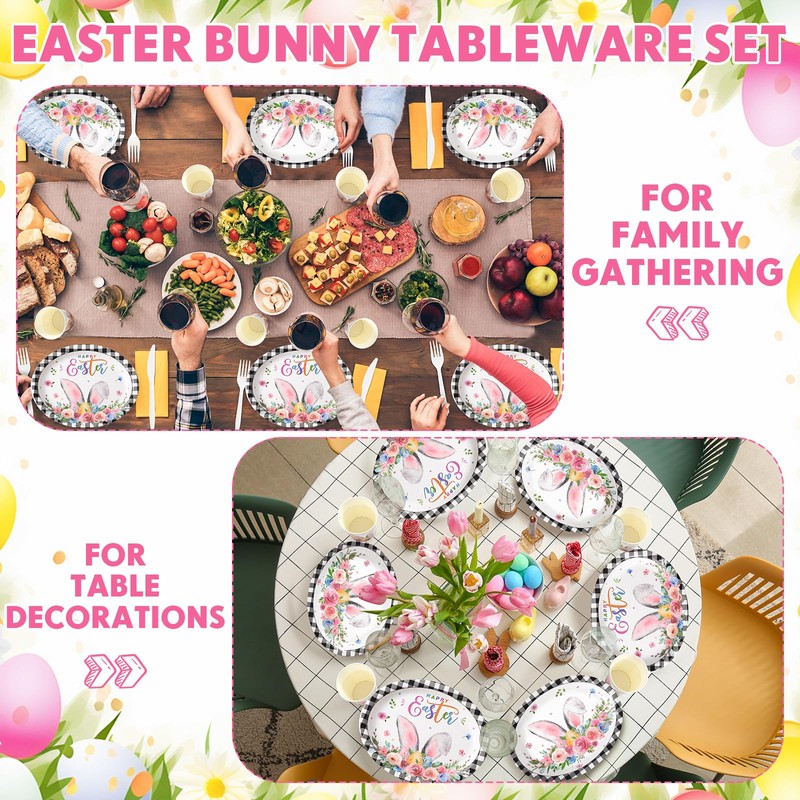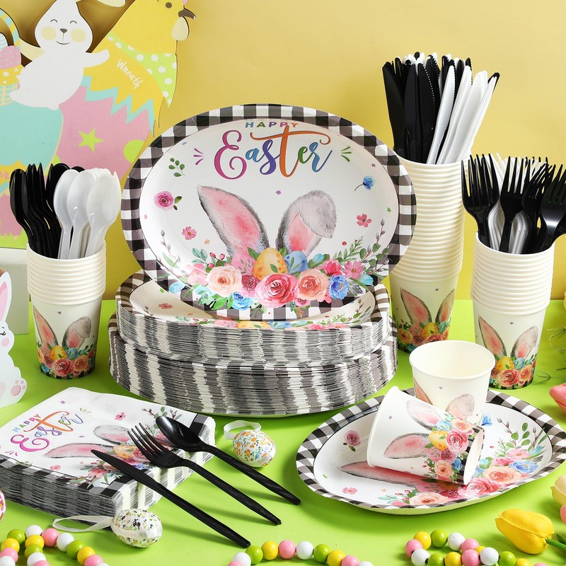 - Classic Design: this Easter tableware set consists of paintings of bunny ear, flowers, black and white buffalo plaid trims, printed with the words [Happy Easter], these beautiful colors and cute patterns create the atmosphere of warm, and make guests feel the joy of easter