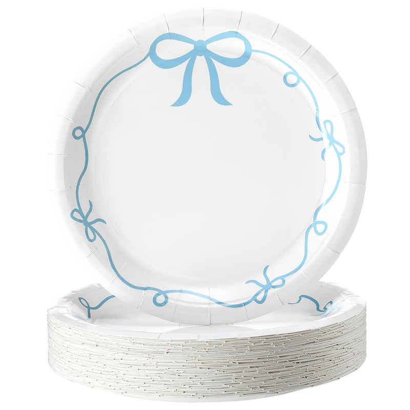 - Coquette Designs: these blue bow disposable paper plates are designed with a combination of blue bows and wavy lines; Its charming pattern enhances your party atmosphere and injects an elegant style; Whether it is a wedding or a bachelorette party, add an irresistible charm
