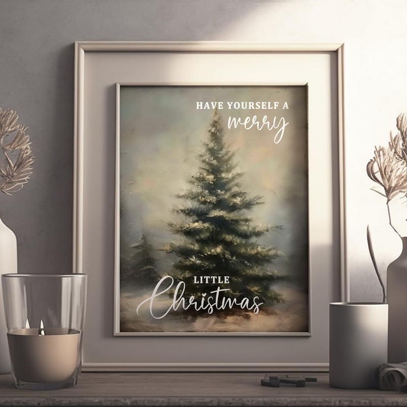 Have Yourself A Merry Little Christmas Print, Retro Lighted Winter Pine Botanical Aesthetic Print, Christmas Tree Painting Print Wall Decor, Home Office Christmas Decor (8 X 10 INCH Print Unframed)