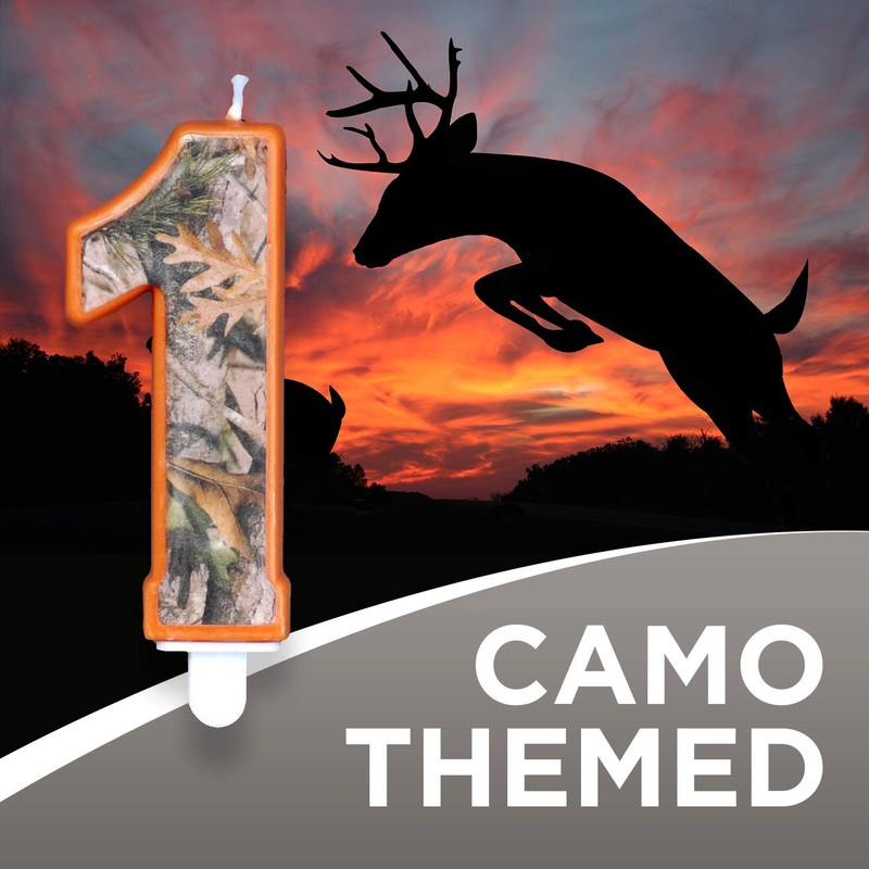 You can decorate a tasty cake or a delightfully large cupcake with this candle. It is made from an orange-colored wax that includes a wick and a print of the next camo pattern. This candle is shaped as the number "1" and with a height of 3". Its slow burn makes it ideal to reuse for future celebrations. All you need to do is to wash it thoroughly and store it properly.