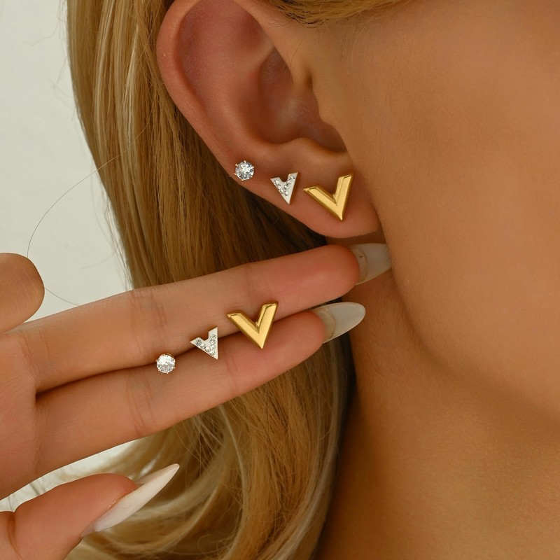 Havopso 18K Gold Stud Set V Shaped Earring for Women Dainty Cubic Zirconia Studs Hypoallergenic Cute Studs Stainless Steel Jewelry 3 Pairs