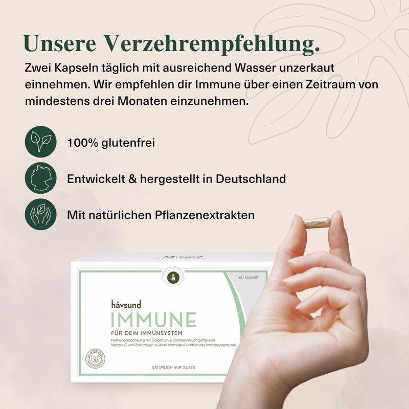 - Natural support for the immune system - håvsund immune capsules have been developed to naturally support the immune system. A specially coordinated complex with colostrum, zinc, vitamin C and other valuable nutrients. 100% vegetarian, gluten-free and no additives.