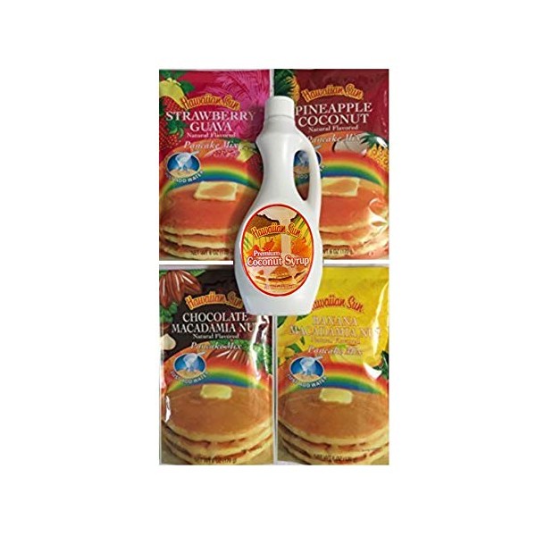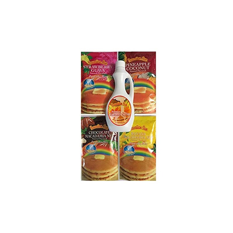 This five piece set is perfect for the tropical pancake lover or great for a present. Simply add water and cook. Each pack is approx. 4.5 servings. Includes 4 packs of pancake mix. One strawberry guava, one banana macadamia, one chocolate macadamia, one pineapple coconut and one 12.5 ounce bottle of syrup.