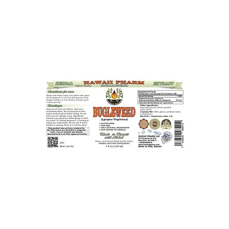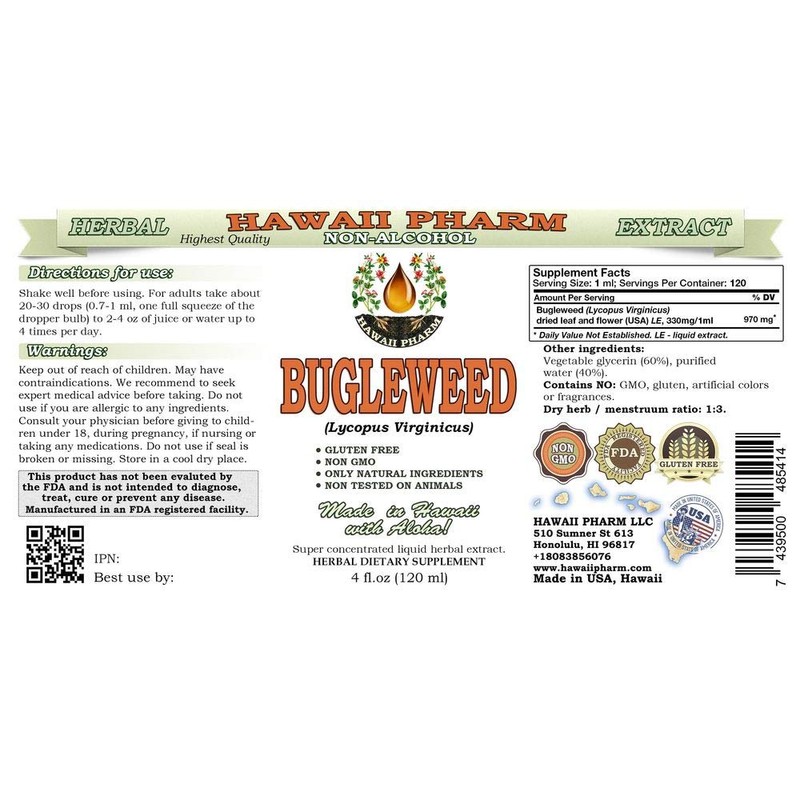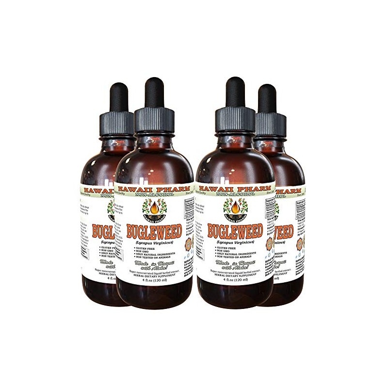 Bugleweed Alcohol-Free Liquid Extract, Organic Bugleweed (Lycopus Virginicus) Dried Leaf and Flower Glycerite Hawaii Pharm Natural Herbal Supplement 4x4 oz