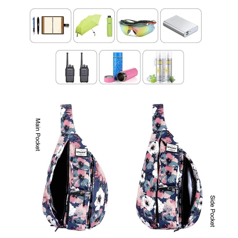 - Multi-purpose Sling Backpack: Unisex, practical, durable, lightweight, high storage capacity, designed with 5 multi-function compartments: 2 front pockets for quick and easy access to small items, keys ,etc ; 2 main zip pockets for clothes, books, Ipad, bottle, umbrella, etc; Anti-theft zip pocket on the back (with headphone jack) for your cellphone or purse