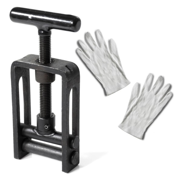 The package includes a squeeze-off tool and a pair of cotton gloves.