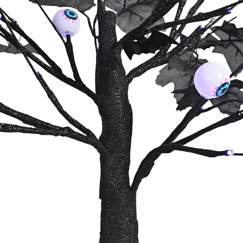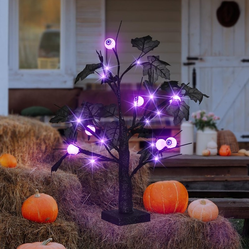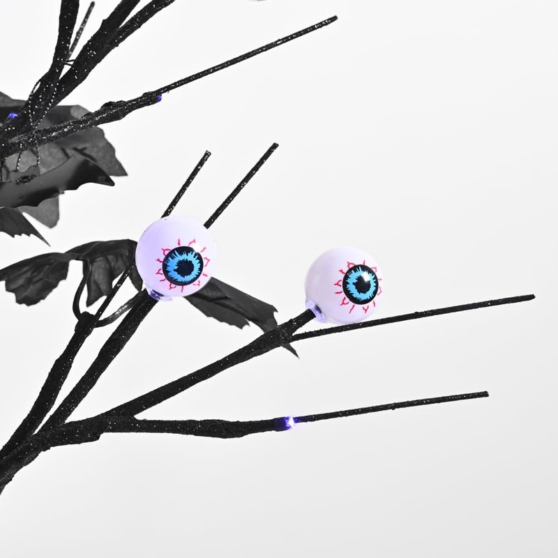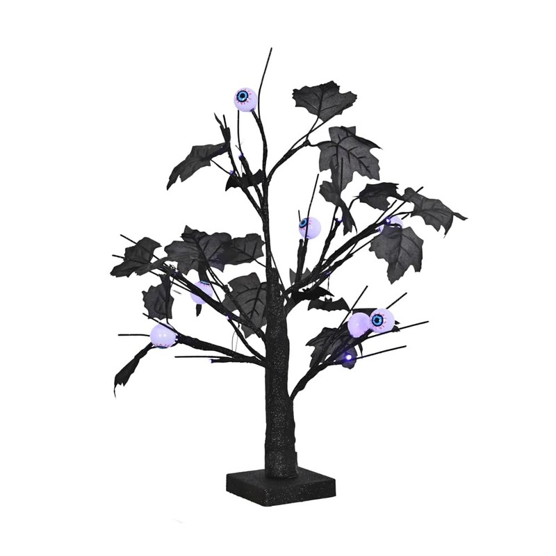 - 【Black Halloween Tree】Black halloween tree overall height 18 Inch with 24LED Orange lights and 10pcs eye ornaments, 20 maples leafedcreate a extreme spooky and festival atmosphere for your Halloween party.