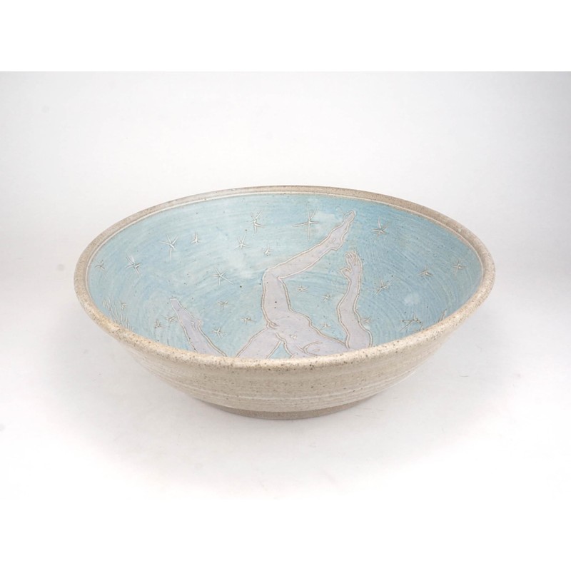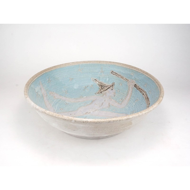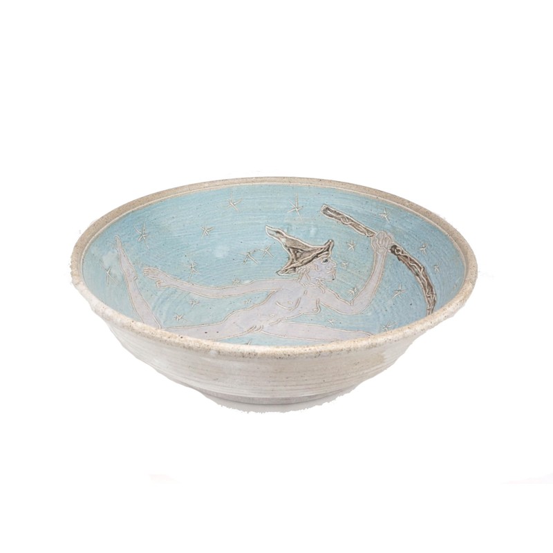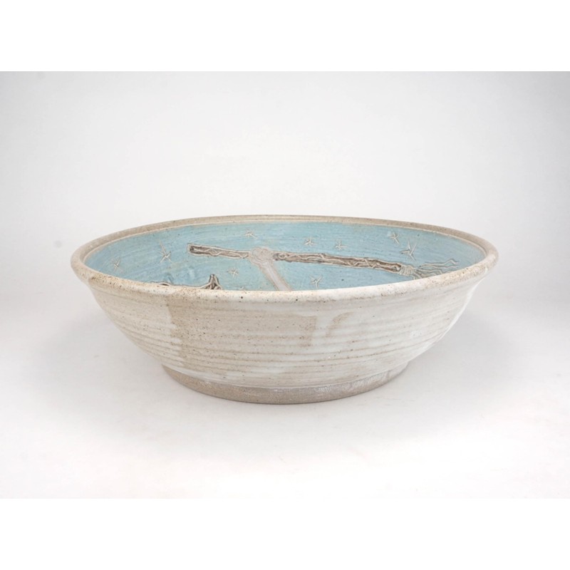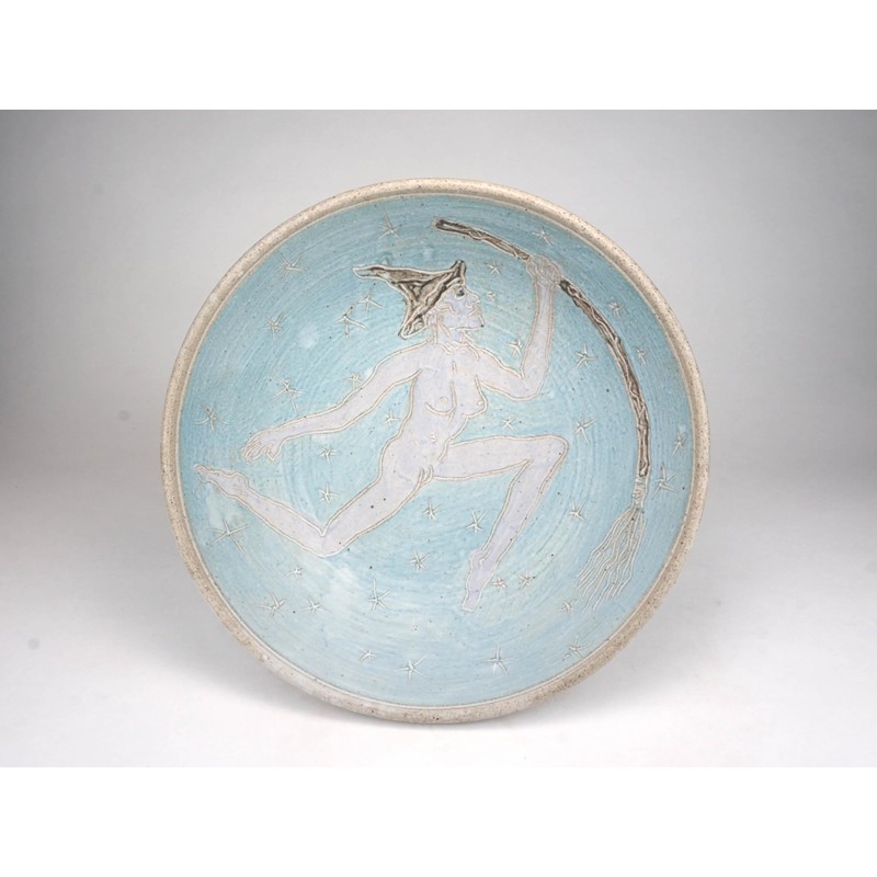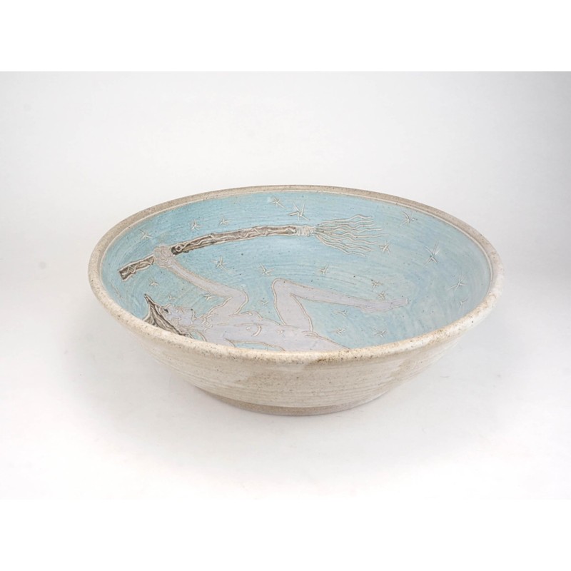 This extra large bowl is a great size and shape for a bread bowl or large salad serving or fruit bowl. Lined with turquoise slip and incised with stars, a classic lavender Witch figure roams the universe holding her broom. Glazed with matte white glaze this jumps out to you! 11.5 inches wide by 3.5 inches tall. This makes a great altar or table piece. Food, microwave, and dish washer safe!