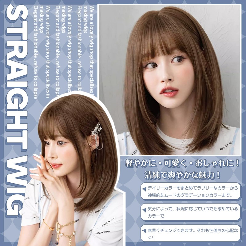 • ❀オススメシーン:今大人気の日常カラーをまとめて、仮装やコスプレ、女装、文化祭などにもぴったりな甘くてやさしいミディアムストレートのフルウィッグスタイルです!鎖骨に届くミディアムスタイル!重量感のあるワンレンスタイルにレイヤーを入れ!全体的に優雅でスタイリッシュな印象に仕上げました!柔らかくフェイスラインをカバーし小顔効果抜群!レイヤーや毛先の動きも分かりやすくみえるので、顔周りをパッと華やかにみせてくれます。 シンプルなお洋服やモノトーンコーデなどにもおすすめです。ほどよく渋みの入った色合いは、新色として登場してからずっと人気のカラーです。デイリー使用にもおすすめのアイテムです!