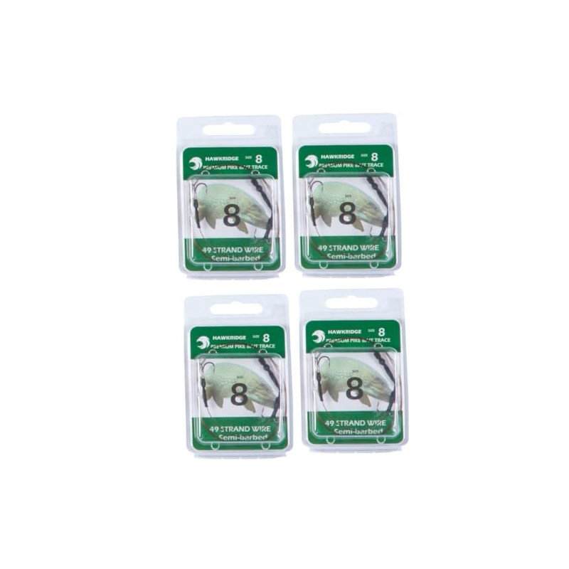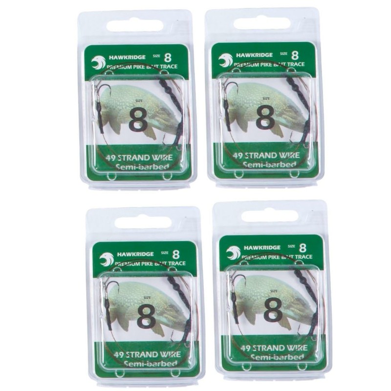 HAWKRIDGE - 4 x Predator SEMI BARBED Pike Snap Tackle Double Hook Bait Rig 30cm Trace Using American 7x7 Wire Strands - Available in Size 4, 6 or 8 (4 x size 8 hook)