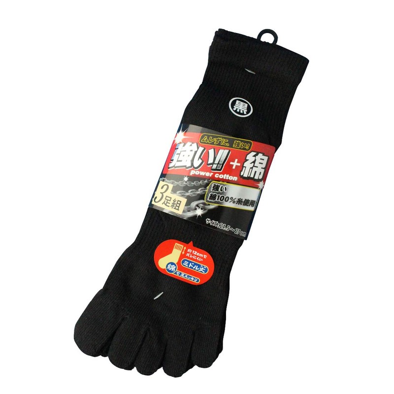 Hayashi (PM625) Men's Socks, Middle Length, 5 Toes, Military Feet, "Strong + Cotton" Z-Twist Yarn, 100% Cotton, Black, 3 Pairs Set, 9.6 - 10.6 inches (24.5 - 27 cm), Black