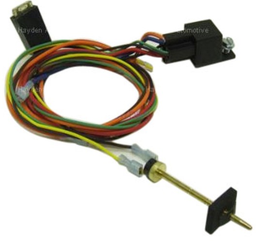 Hayden Auxiliary Fan Control Unit -- HAYDEN PRESET THERMOSTATIC FAN CONTROL KIT -- 185 degrees Fahrenheit fan on temperature, 170 degrees fan off temperature, dual fan, push-in probe sending unit style; Includes sending unit, relay, and wiring harness; Does not include manual override switch and air conditioning relay; Allows your electric fan to turn on and off at certain temperatures; Compatible with own fans and OE cooling fans.