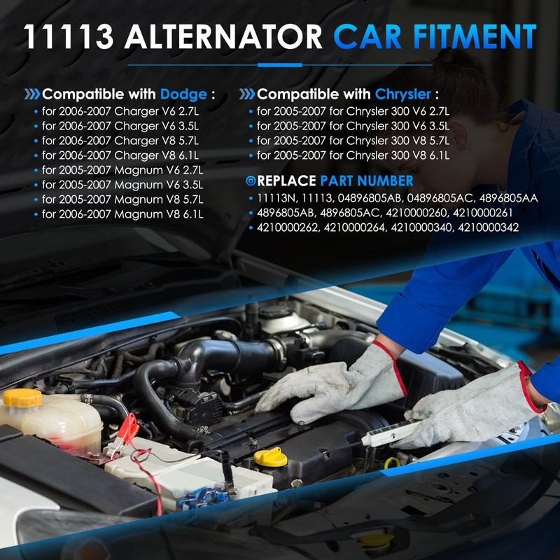 - [Vehicle Fitment]: 421000-0260 alternator replacement for Chrysler 300 2005-2007 V6 2.7L/V6 3.5L/V8 5.7L/V8 6.1L Alternator | for Dodge Charger 2006-2007 V6 2.7L/V6 3.5L/V8 5.7L/V8 6.1L Alternator | for Dodge Magnum 2005-2007 V6 2.7L/V6 3.5L/V8 5.7L Alternator | for Dodge Magnum 2006-2007 V8 6.1L Alternator. [Important Notice]: Before purchasing HAYIAUTO new alternator, please verify the part number, OEM alternator pictures, specifications, vehicle make, model, and engine type to ensure this is the correct alternator for your car.