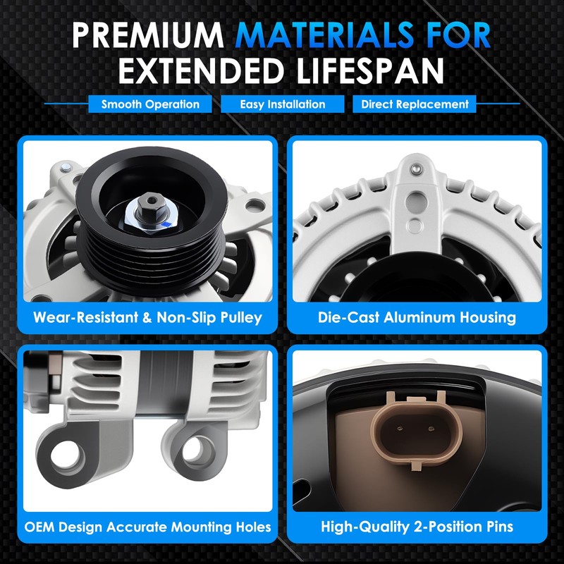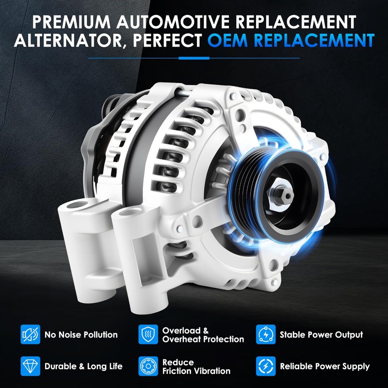 - Premium Auto Parts Alternator: Made with high-grade aluminum materials for long-lasting performance. Provides automotive replacement alternators with precision CNC machined castings, higher output power, and more cooling, which reduces stress on the alternator and extends its service life