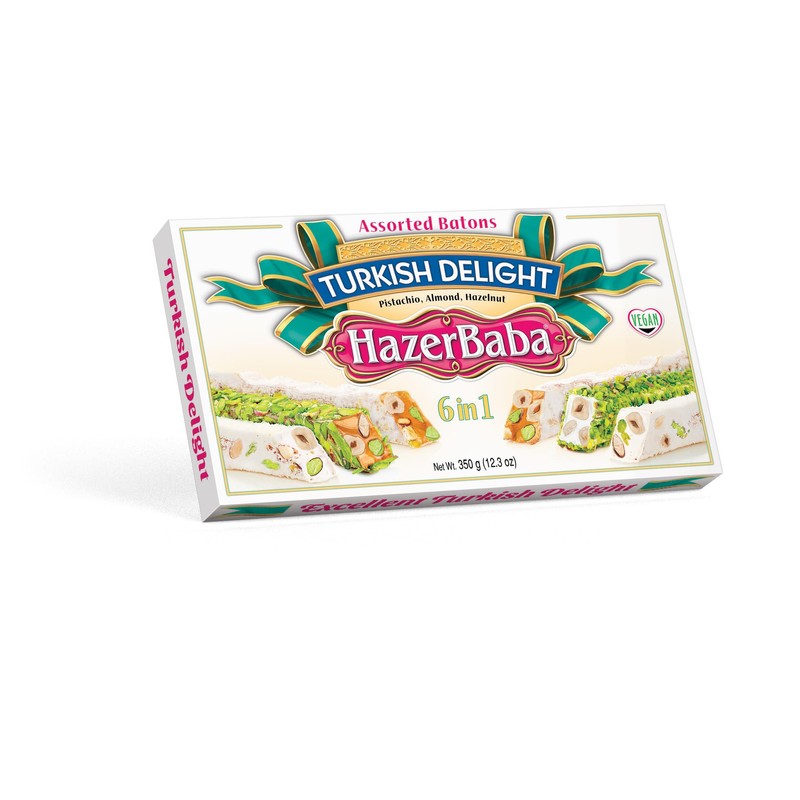 Hazer Baba Turkish Delight Candy Mixed, Gourmet Snacks Box Gift, Traditional, Coconut Dusted Sultan, Pistachio Dusted Botton, Mixed Nuts, Vegan Candy Lokum, Premium Quality Snacks Gift Box 12.3 Oz