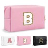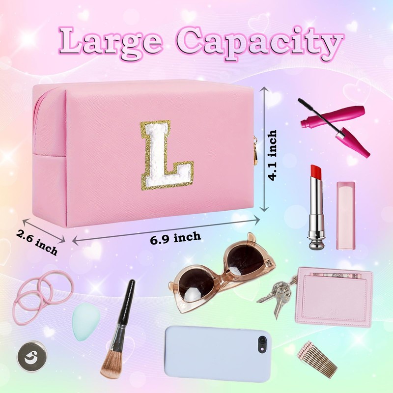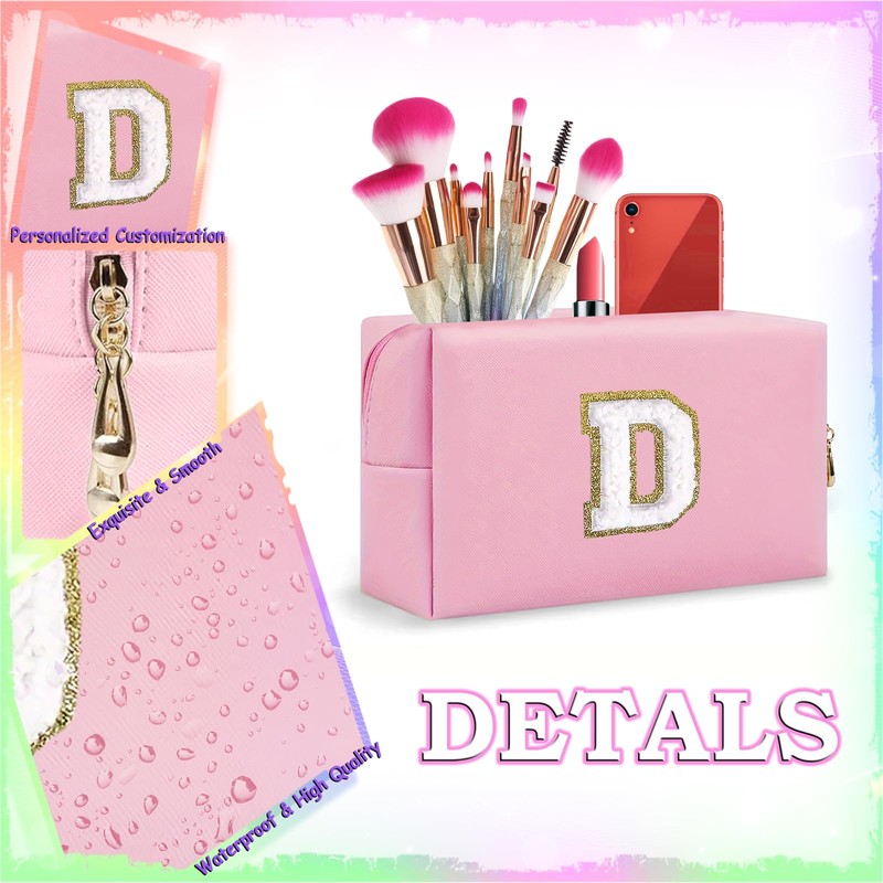- 【PERSONALIZED INITIAL PATCH DESIGN】Preppy makeup bag boasts a gold glitter chenille patch that is not only stylish but also skin-friendly and comfortable to touch.The cute monogram patch has a strong personalized style, and it is sewn onto this pink makeup bag to brighten up the look and add a personalized touch