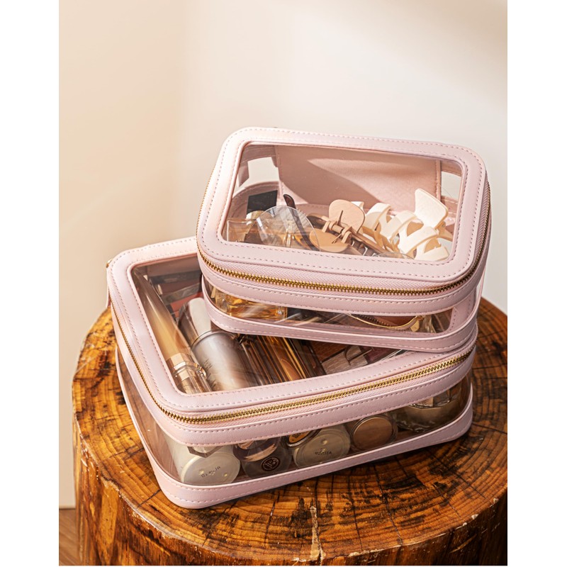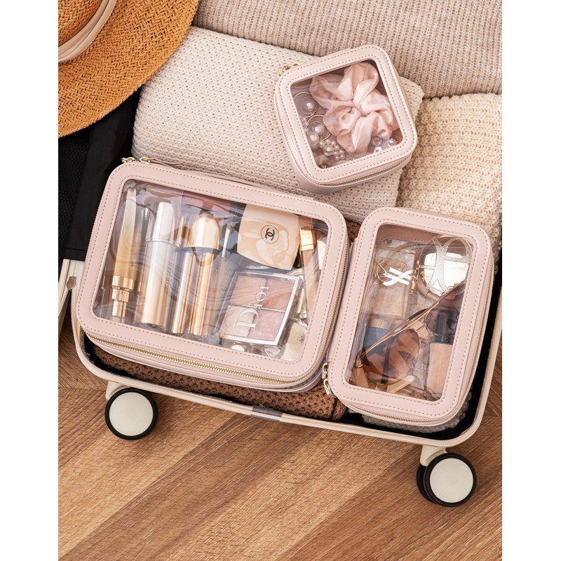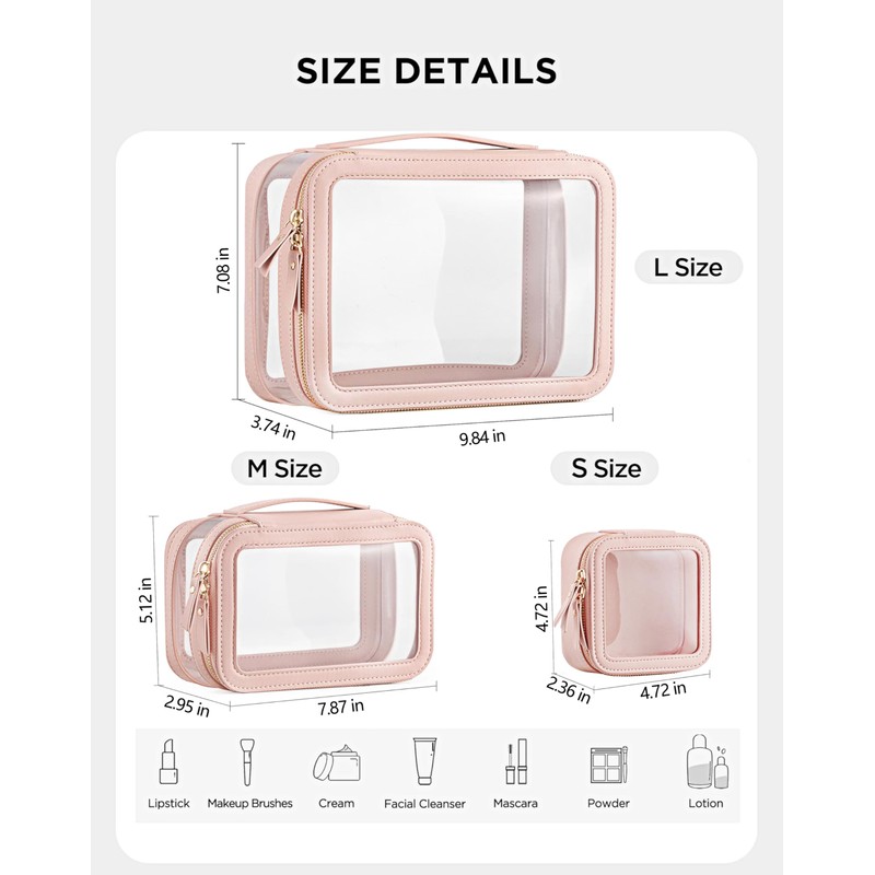 - [Three-Piece Set] Large Size: 9.84x7.08x3.74inch(LxWxH); Medium Size: 7.87x5.12x2.95inch(LxWxH); Mini Size:4.72x4.72x2.36inch(LxWxH); The clear bag set consists of two different sizes, specifically designed to separate makeup and skincare products effectively.