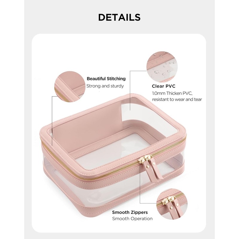 - 【Premium Material and Durability】Clear makeup bags made of 1.0mm thick PVC which feels durable and lightweight, can keep a good structure while matching with PU leather, beautiful stitches and Smooth Zipper, this make up bag is durable for long-lasting use.