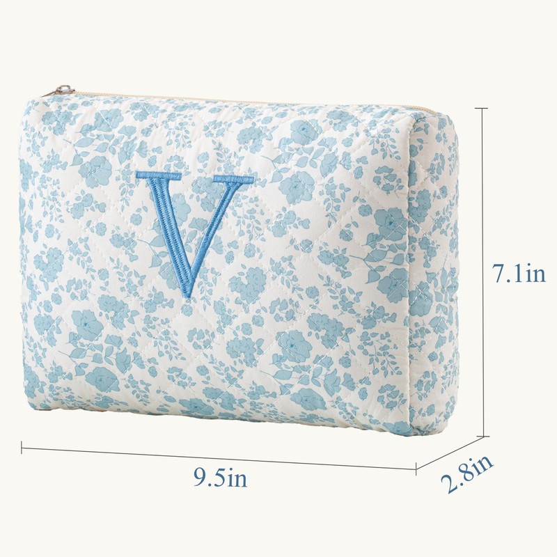 HBselect Initial Makeup Bag, Quilted Makeup Bag, Cotton Large Travel Makeup Bag, Cute Floral Coquette Make up Bag Cosmetic Bag Toiletry Bag for Women Girls V