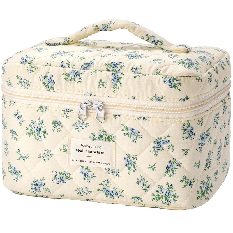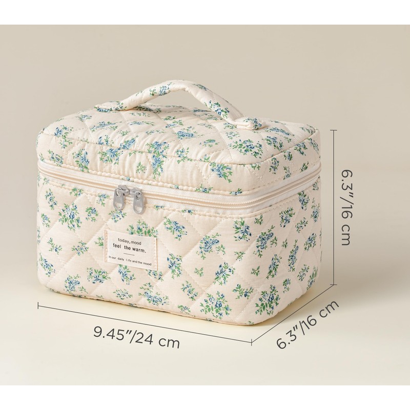 HBselect Quilted Makeup Bag for Women, Floral Cotton Cosmetic Bag Large Travel Makeup Bag Coquette Aesthetic Toiletry Bag