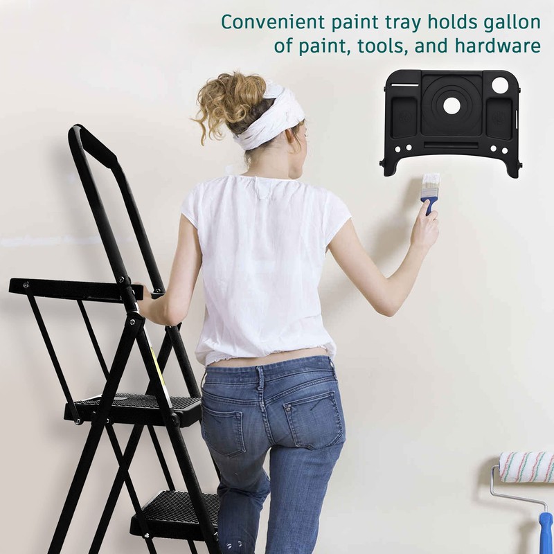 HBTower 3 Step Ladder with Tool Tray, Folding Step Stool with Wide Non-Slip Pedal and Comfort Handgrip for Household and Office, Lightweight 500lbs Capacity Step Ladder, Black