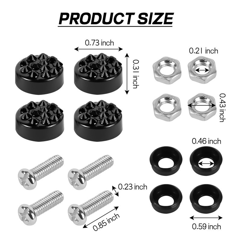 - 【Package & Installation】: The package contains 4 screws, 4 screw caps, 4 nuts and 4 washers. For installation, it's easy and you may need the help of a screwdriver, just then fix these accessories and the license plate to the car in order. The threads are precise, so it is solid after mounting.