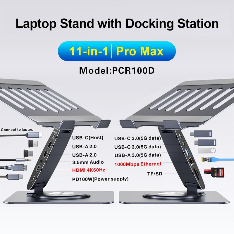 Laptop Docking Station for MacBook Pro/Air/Dell/HP/Surface HC 11-in-1 USB C Hub 360°Rotatable Laptop Stand with USB Hub 4K HDMI USB 3.0 PD100W 3.5mm Audio Jack RJ 45 TF/SD Reader Universal Laptop Dock