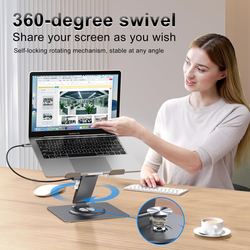 - Adjustable and 360 Degrees Rotatable It can be adjusted in height, angle and folded. The foldable design makes it convenient to carry around. The USB C dock stands perfectly combine the function of a USB C dock and a laptop stand, making it the best choice for your USB C laptop with more features and possibilities. This laptop Stand Docking Station can be rotated 360 degrees, allowing you to easily share your laptop screen with your friends or colleagues