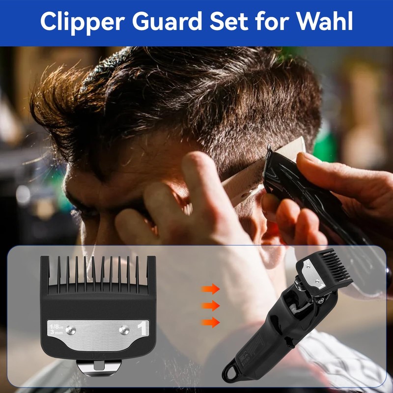 - For Wahl Clipper Guard SetThis universal clipper guard set is designed for Wahl beard trimmer attachment, the blade size is 3.9 inches x 1.96 inches (different sizes of Wahl clipper size combs allow you to cut different lengths of hair), Fits all Wahl full size clippers blades except for Competition Series and 5-in-1 Magic blades, which provides you more hairstyle choices