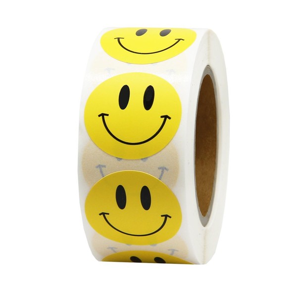 Hcode Happy Face Paper Stickers, 1 Inch Yellow, 500 Pieces per Roll, Permanent Adhesive, for Teachers, Parties, Rewards, Kids