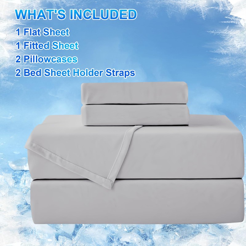 • 【What You Get】Cooling queen sheet set includes 1 cooling flat sheet (90" x 102"), 1 cooling fitted sheet (60" x 80"), 2 double sided cooling pillowcases (20" x 30"), and 2 sheets straps. It's the perfect choice for improving your sleep quality and enhancing your lifestyle.