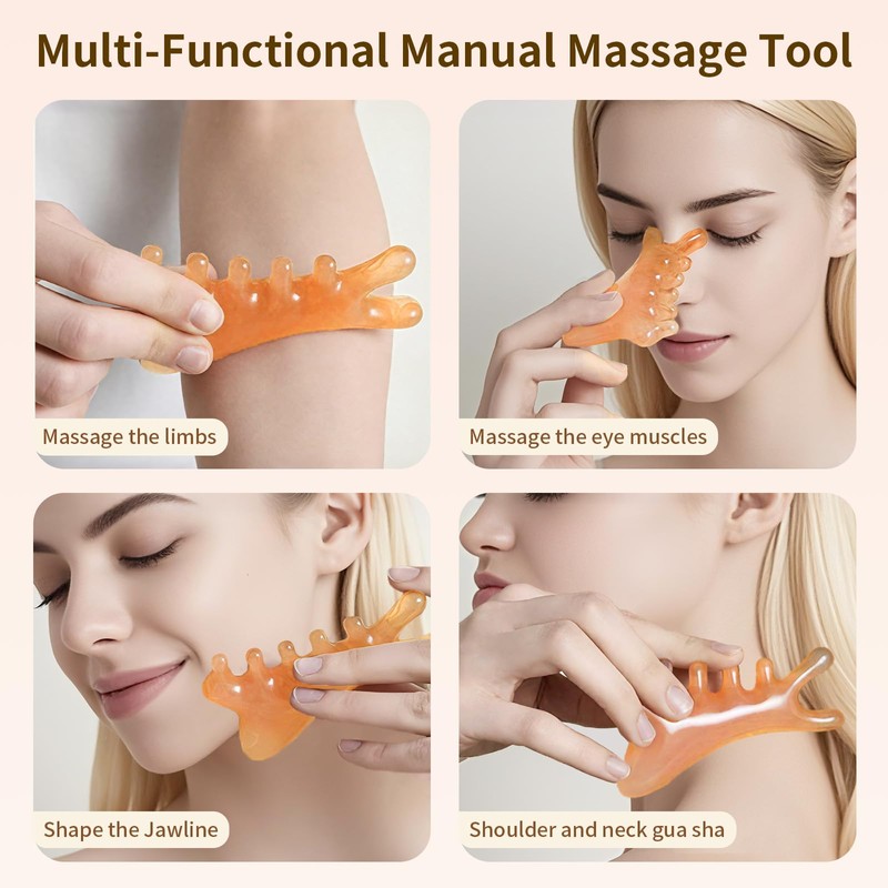 - 【 Multi-functional Gua Sha Board 】 A Gua Sha Board with four functions in one. Gua Sha can improve blood circulation, enhance lymphatic drainage, boost skin vitality. Increase the absorption of skin care products; Increase the production of collagen and elastin; Oxidize the skin; Reduce swelling; Relax the tension in the face