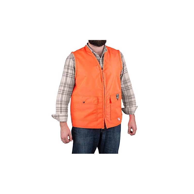 Heavy duty blaze orange vest with two large front pockets with shell loops. This briar proof vest is outfitted with D-rings for optional game bag and has zip-up front. Made in U.S.A.