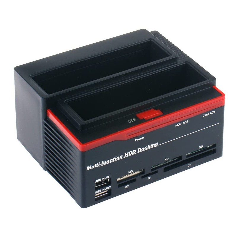 item: HDD Dock can accommodate/store/exchange/backup 1x 2.5/3.5 and 1x IDE hard drives; USB 2.0 interface enables data transfer rates up to 480 Mbps; MS/M2/XD/CF/SD/TF card reader; 2 ports USB 2.0 HUB.